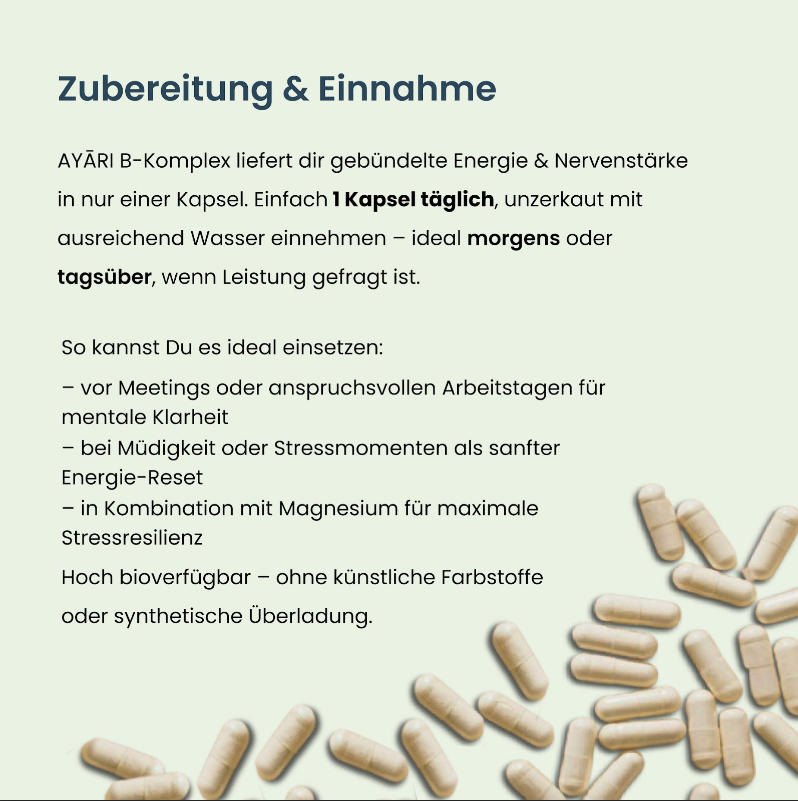 The AYARI B-Complex provides all eight B vitamins in bioactive forms, including pyridoxal-5-phosphate (B6), methylcobalamin (B12) and 5-MTHF (folic acid), which promote optimal absorption. In addition, the formula contains choline and inositol to support fat metabolism and liver health - without fillers, manufactured to the highest quality standards in Germany.