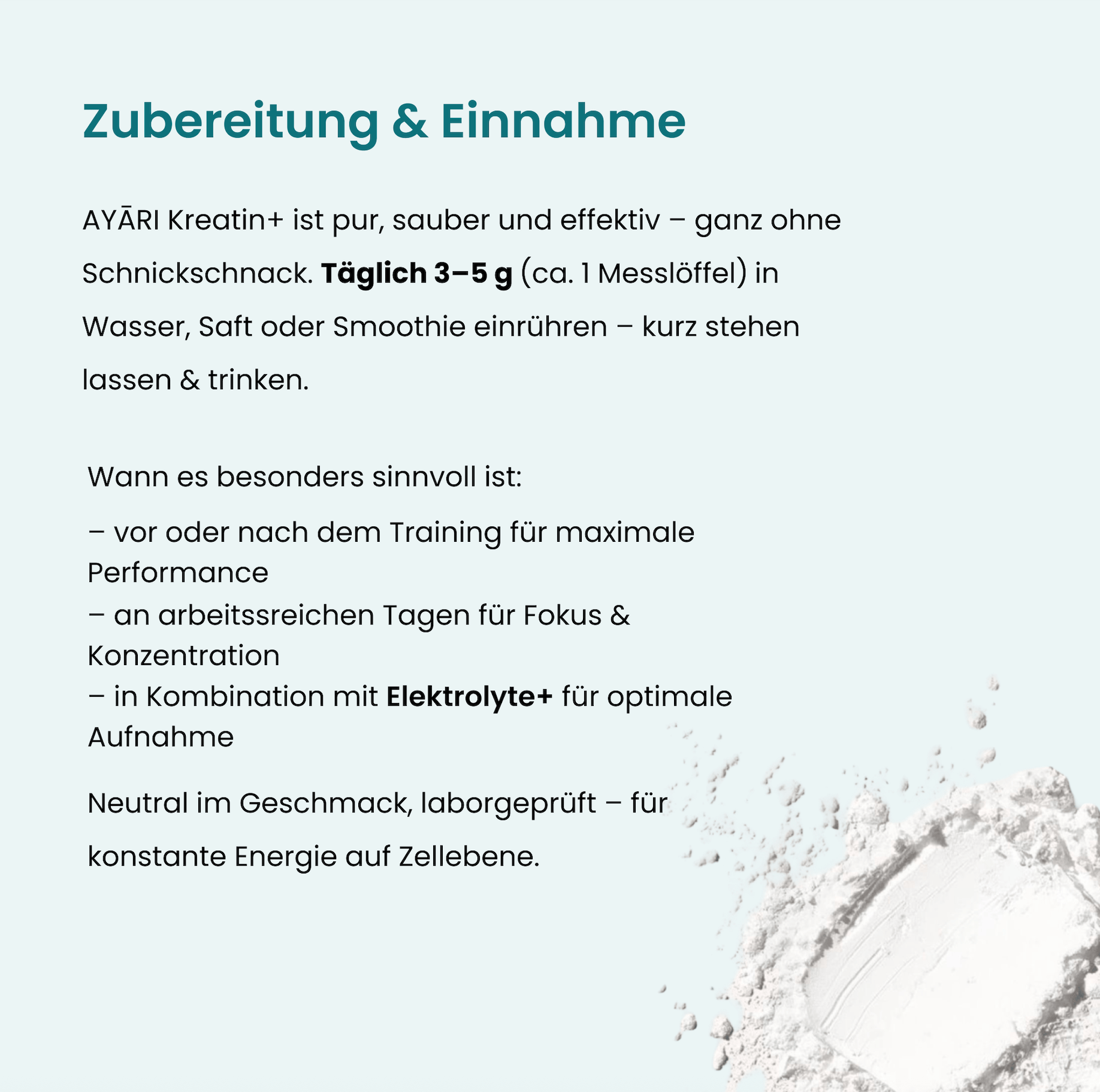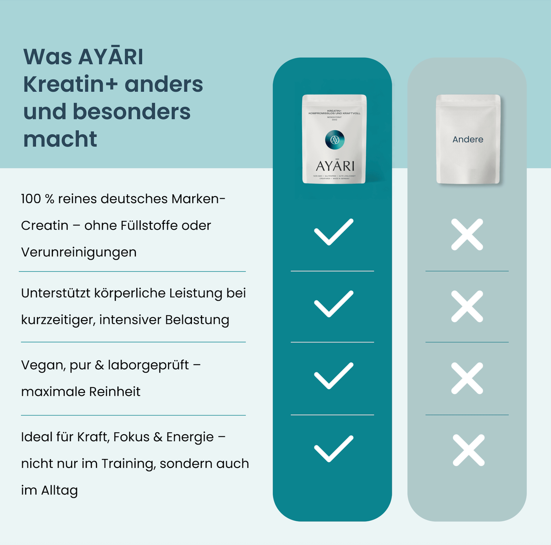 Supplementation can also be beneficial for vegan or low-meat diets – AYARI CREATINE⁺provides you with an uncompromising solution: pure, vegan, effective.