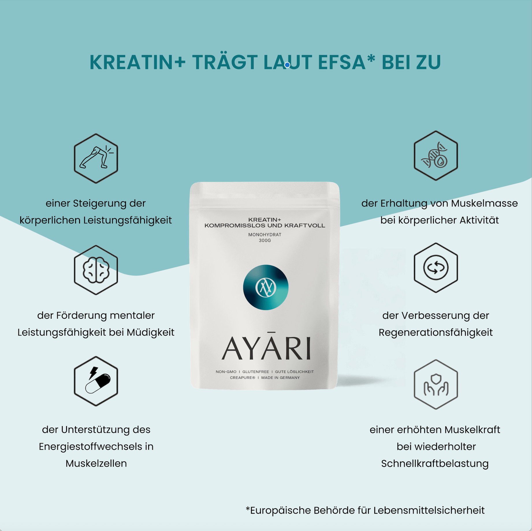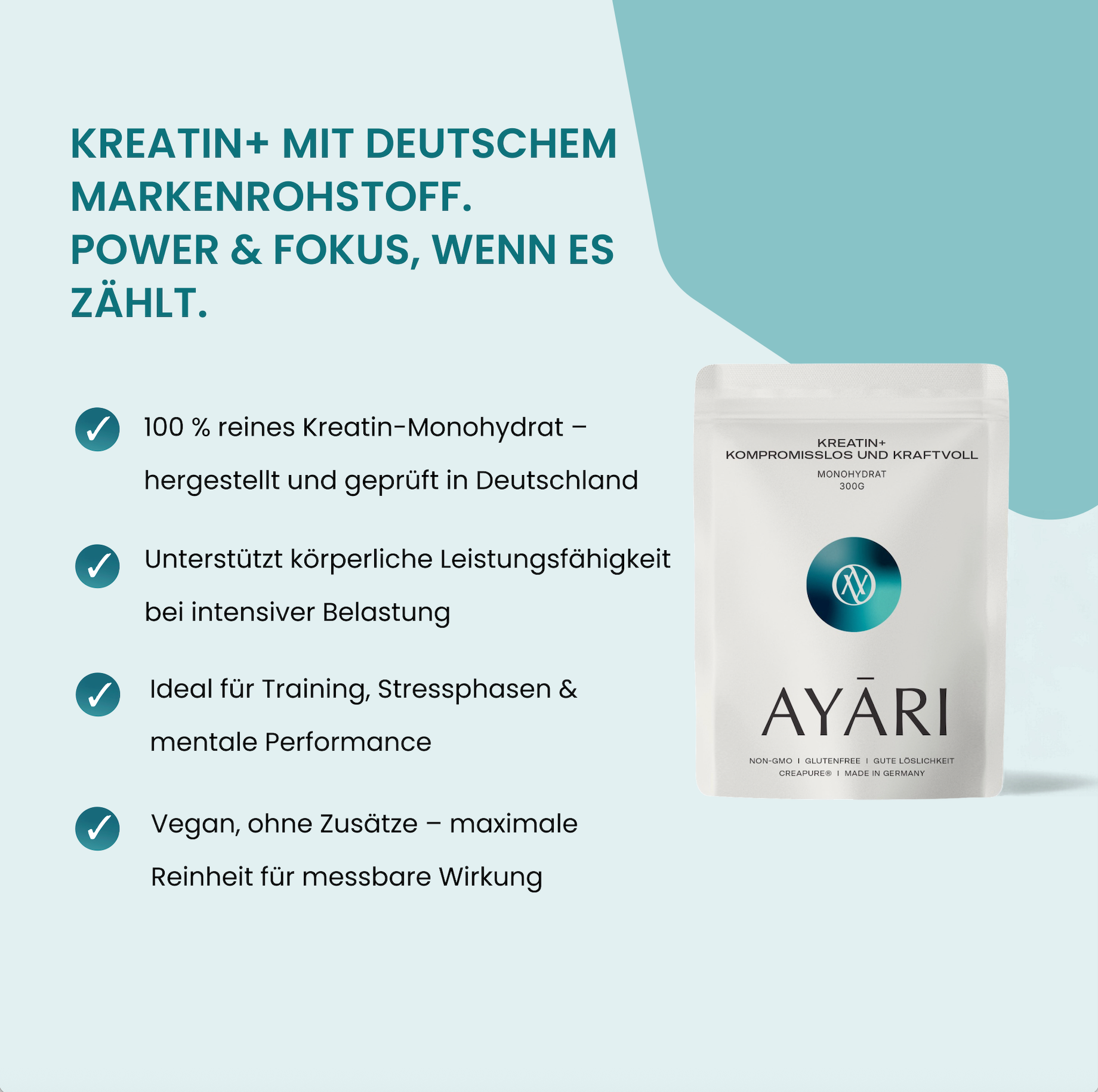 AYARI CREATINE⁺ consists of 100% patented branded raw material – one of the world's purest and most tested creatine monohydrate raw materials, manufactured in Germany under the strictest quality standards.