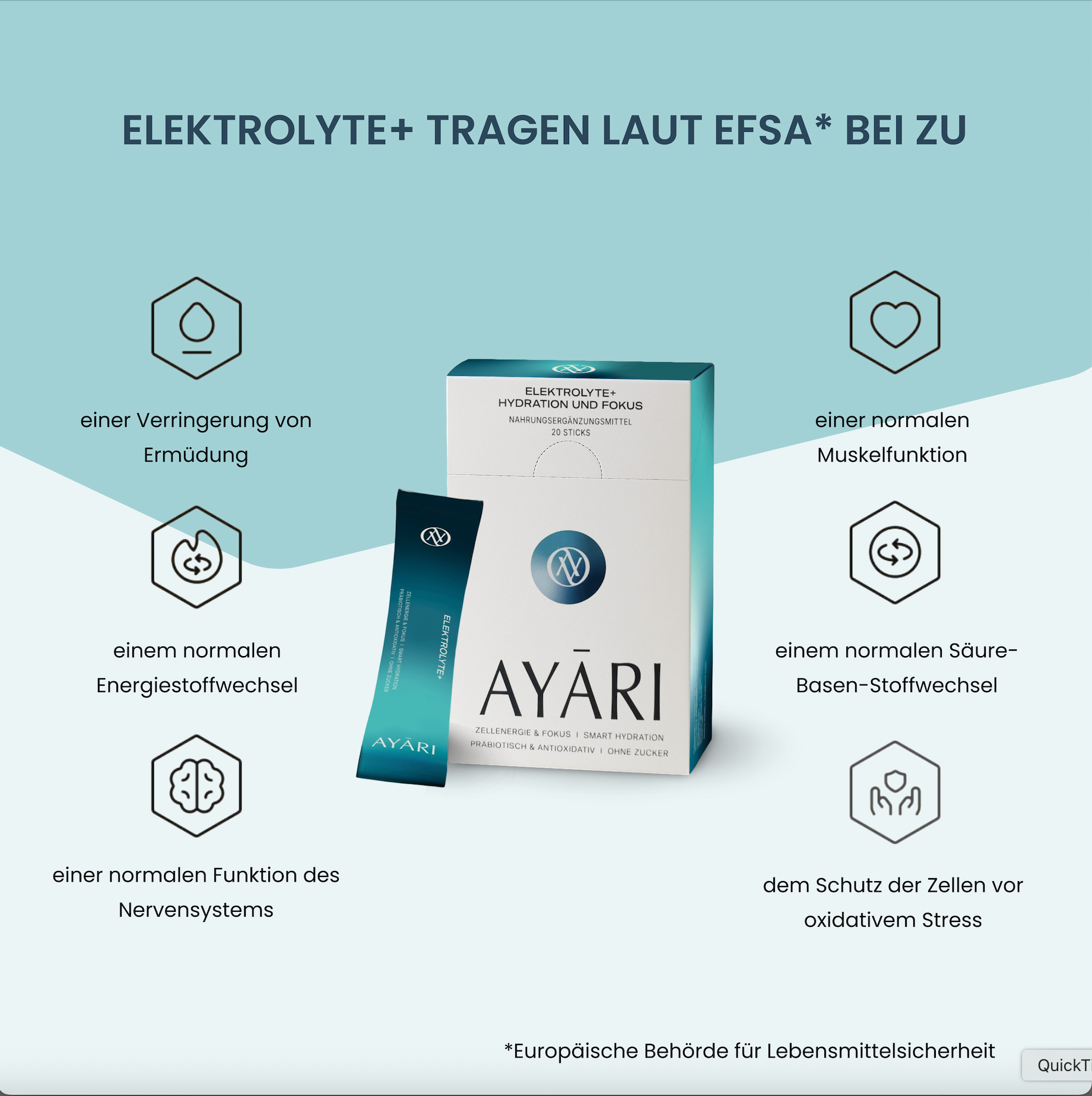 AYARI ELEKTROLYTE+: schnell löslich, sanfter Geschmack, ohne Zuckerzusatz, ohne Oxid, vegan.