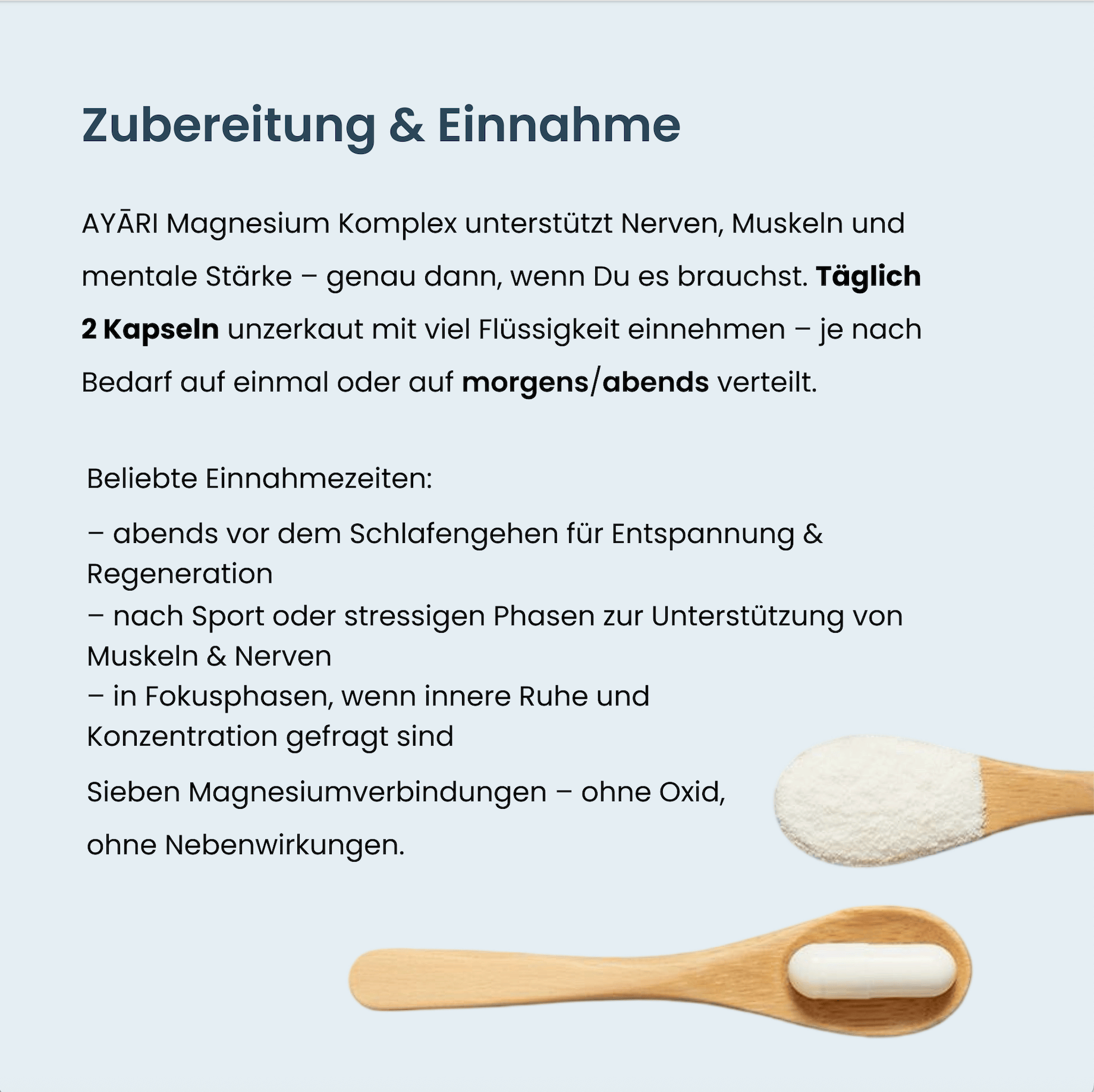 Wir haben bewusst auf Magnesiumoxid verzichtet, um eine bessere Verträglichkeit und Bioverfügbarkeit zu gewährleisten – für beste Ergebnisse ohne unnötige Zusätze.