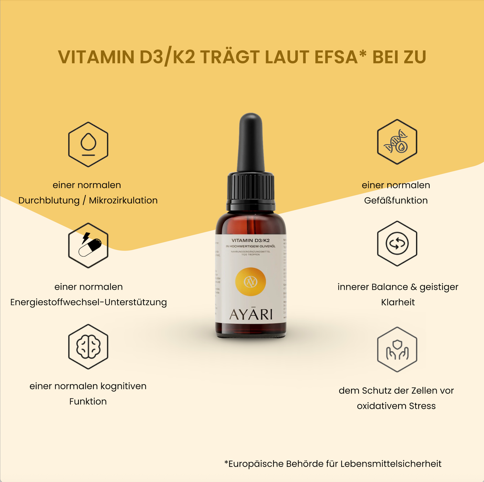 Unser AYARI Vitamin D3/K2 kombiniert hoch bioverfügbares D3 (Cholecalciferol) und K2-MK7 in der All-trans-Form für optimale Aufnahme und Wirksamkeit. Angereichert mit hochwertigem Olivenöl und MCT-Öl auf Kokosbasis, gewährleistet es maximale Bioverfügbarkeit und flexible Dosierung. Hergestellt in Deutschland, frei von Zusatzstoffen und streng geprüft, bietet AYARI Vitamin D3/K2 die perfekte tägliche Unterstützung für Deine Gesundheit.